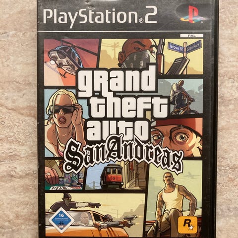 Rockstar Games Grand Theft Auto San Andreas spill til Playstation 2. Spillet leveres i original eske med cover. På bildene vises også manual/hefte og spillplate. Aldersgrense 18 år, som angitt på omslaget. Egnet for bruk på Playstation 2-konsoll som støtter dette formatet.