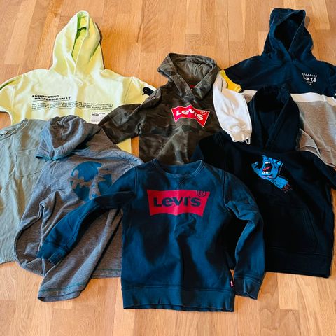 Tommy Hilfiger og Abercrombie hettegensere for gutt i størrelse 10-12 år. Pent brukt. Pakken inneholder flere hettegensere i ulike flerfargede design, blant annet ensfarget blå, sort med trykk, rød/svart mønster og kamuflasjemønster. Hettegenserne har lange ermer og hette, og passer til hverdagsbruk for gutt i aktuell størrelse.