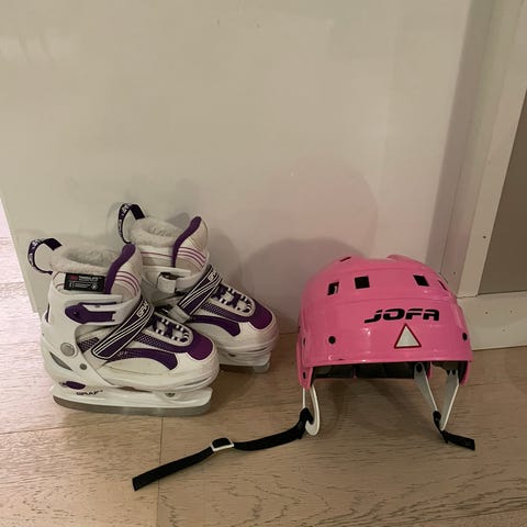 Graf regulererbare skøyter til barn, størrelsen kan justeres fra str 31-34. Blå, hvit og sort farge. Godt brukt men er i orden.