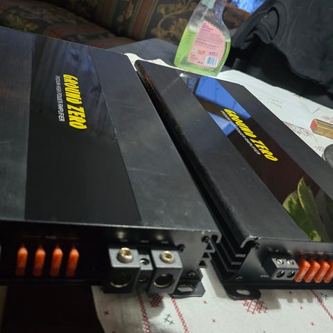 Ground Zero og Audiocomp bilstereo med subwoofer, forsterkere, høyttalere og div kabler.