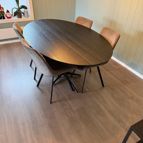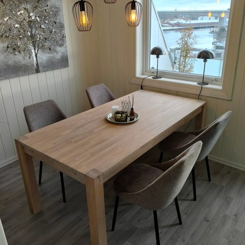 Kjempe fint, robust og pent brukt spisebord laget i furu, i en gråfarge med hvite ben. Lakkbeiset. Ny pris: 8000kr