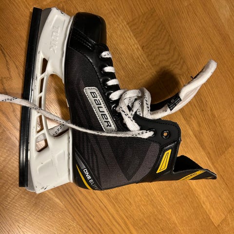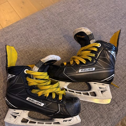 Bauer ishockeyskøyter i svart og hvit med gule detaljer. Skøytene har klassisk snøring og solid plastklinge tilpasset ishockeybruk. Egner seg til isaktiviteter og trening i ishall eller på utendørs isbaner.
