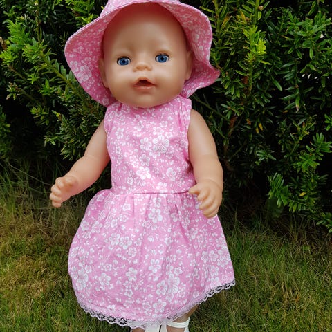 Kjole og hatt til Baby Born sydd i bomullstoff