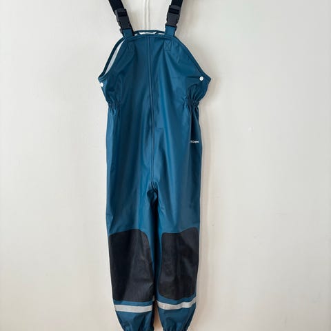 Tretorn regnbukse for barn i størrelse 128. Regnbuksen er blågrønn og laget i polyester. Modellen er unisex og har seler og strikk i livet for bedre passform. Det er forsterkede felt nederst på bena og refleksdetaljer for økt synlighet. Egnet som ytterplagg i vått vær til bruk i barnehage, skole og fritid.