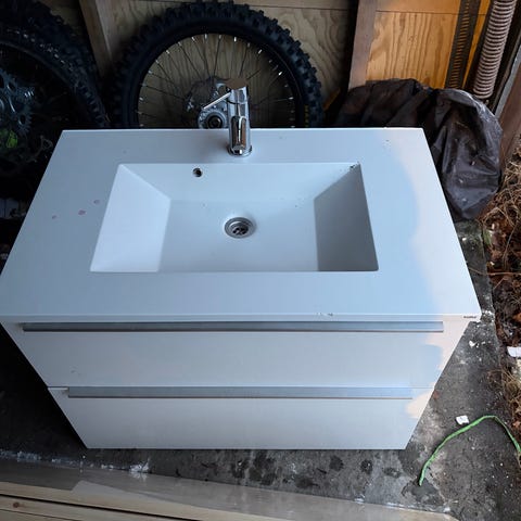 Ballingslöv baderomsinnredning med servantskap og i hvit utførelse. Innredningen består av et vegghengt servantskap med integrert servant og blandebatteri. Skapet har flere skuffer for oppbevaring av baderomsartikler.