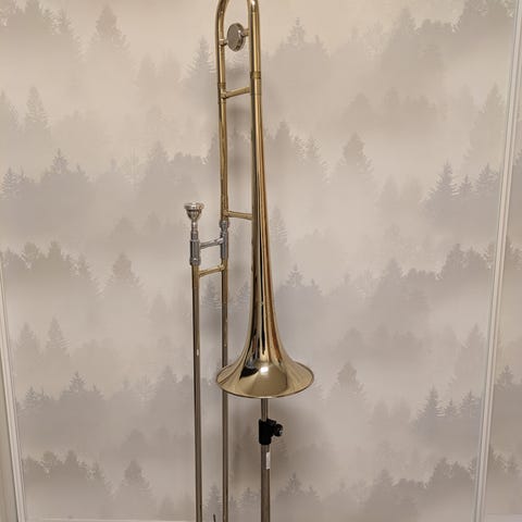 Sammenleggbart trombonestativ i metall. Stativet har tre ben for stabilitet og høydejustering for å passe ulike typer tromboner. Egnet for oppbevaring og plassering av trombone under øving og pauser. Kan foldes sammen for enkel transport og lagring.