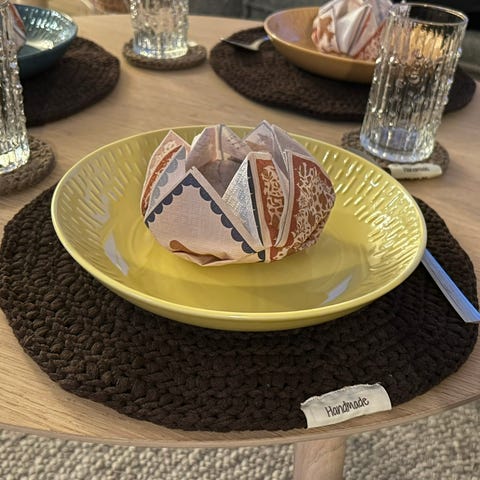Heklede spise- og glassbrikker selges, 8stk, i fargen Oker. Selges helst samlet, 300kr/per (inkl glassbrikke)
