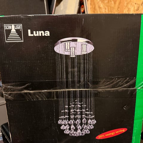 Lampen er komplett og har aldri vært brukt, kun pakket opp fra esken for å se. All deler og prismer ligger fortsatt pakket i poser.