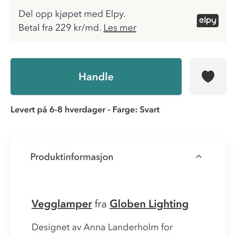 Globen Lighting Vegglampe Astoria fra Ellos selges. Som ny, ingen synlige merker