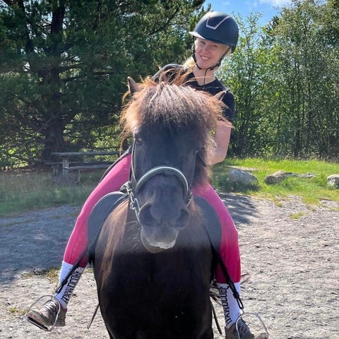 Hun er veldig glad i å bli ridd tur og er supergrei å ha med på leietom med liten rytter på ryggen. Elsker å få være med på tur som løshest også.