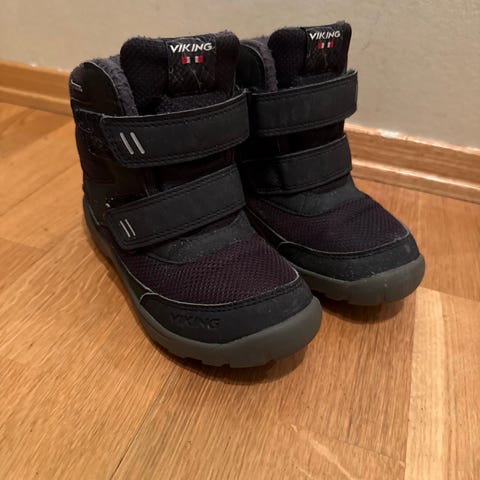 Viking Kjetil Velcro GTX vintersko for barn i størrelse 30. Skoene er i fargen svart/lime og har to borrelåsstropper som gjør dem enkle å ta av og på. Overdelen er laget i et robust materiale med Gore-Tex-membran (GTX) som gir vanntett og pustende funksjon. Kraftig yttersåle med grovt mønster gir godt grep på ulike underlag. Modellen er unisex og passer både gutter og jenter. På bildene vises blant annet slitasje og merker på overdelen samt mønsteret på sålen for inntrykk av brukstilstand.