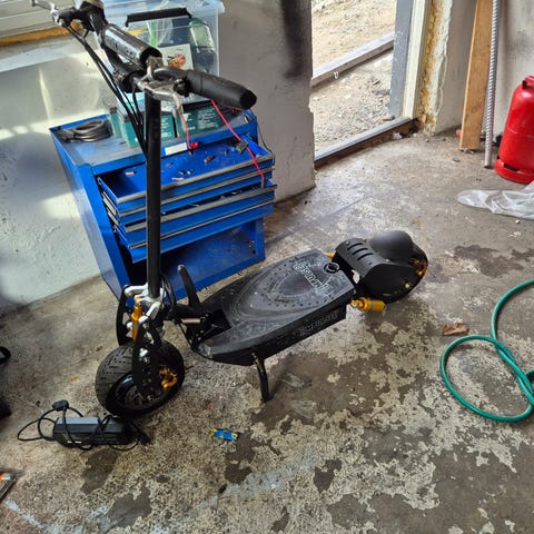 Elektrisk navmotor til sparkesykkel i svart utførelse. Motoren er integrert i et hjul/nav og har aksel med mutter for montering. Det følger med tilkoblingskabel med tre ledninger for elektrisk tilkobling. Passer til bruk på elektrisk sparkesykkel eller lignende små elektriske kjøretøy, forutsatt kompatible mål og elektriske spesifikasjoner. Nøyaktige tekniske data som effekt, spenning og hjuldiameter er ikke angitt og bør kontrolleres av kjøper før bruk.