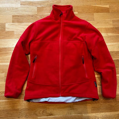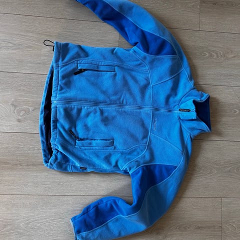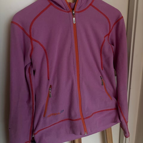 Fleecejakke. Har silkefor på innsiden. Justering nederst på begge sider. Lommer med glidelås. Pent brukt.