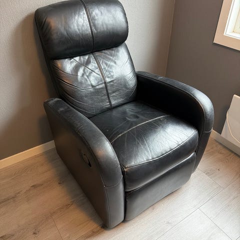 En grå lenestol kan hentes gratis. Brukt med noen flekker