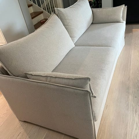 Sovesofa i blå tekstil med rette linjer og avtagbare ryggputer. Sofaen kan legges ned til en liggeflate og fungerer både som sofa og seng. Den har enkle treben som gir god støtte. Passer som ekstra seng på stue, gjesterom eller hybel. Fargen er en dempet blå/grå tone, og treverket har en lys naturfinish. Inkluderer en integrert sengetøykasse under setet for praktisk oppbevaring av dyner og puter. Lite brukt.