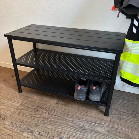 Praktisk sko hylle som rommer mange sko par. Noen synlig slitasje på toppen.