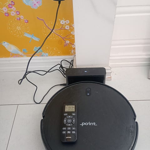 Point robotstøvsuger i svart utførelse. Enheten er rund og kompakt, og kommer med ladestasjon som kobles til strømuttak. Robotstøvsugeren er egnet for rengjøring av harde gulv og lave tepper i hjemmet. Passer til daglig støvsuging av gulvflater uten manuell håndtering.