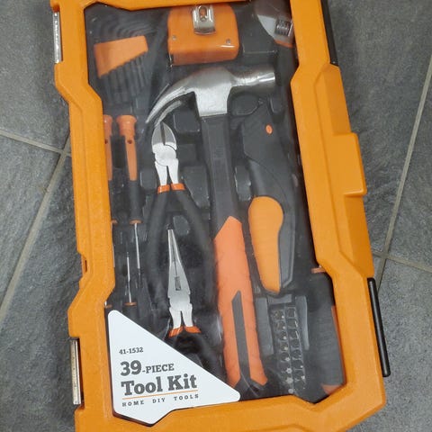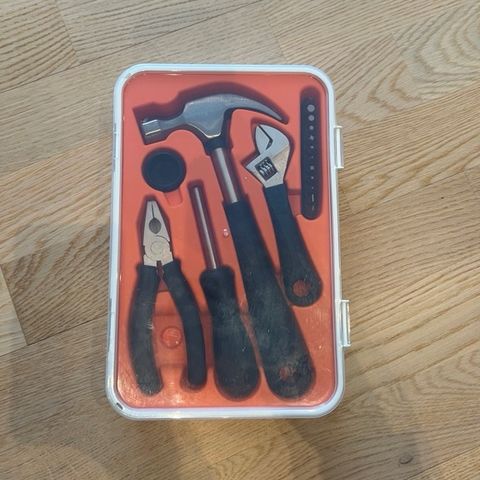 Verktøysett i plastkoffert med formstøpt oransje innsats. Settet inneholder hammer, tang, skiftenøkkel, skrutrekker med utskiftbare bits og en liten rund beholder. Håndtakene er i svart plast/gummi for bedre grep. Egnet til enkle reparasjoner og vedlikeholdsoppgaver i hjemmet eller på hytta.