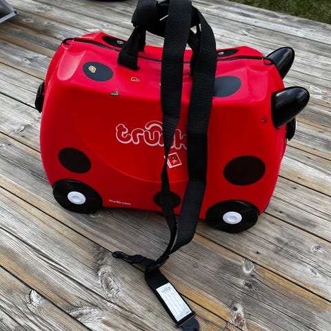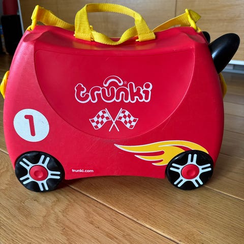 Trunki brannbil barnekoffert i rød plast med gule og blå detaljer. Kofferten har hjul slik at barnet kan sitte og trille på den, samt dra den etter seg med stropp. Innvendig er det stroppesystem for å holde innholdet på plass og en liten lomme/skillevegg. Egnet som håndbagasje for barn på reise og til oppbevaring av leker eller klær.