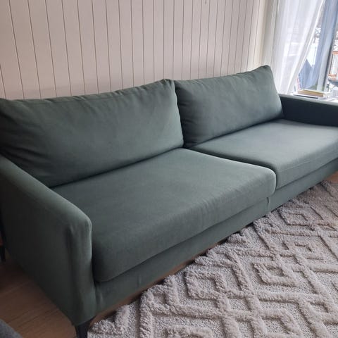 Sofaen ble kjøpt for ca. halvannet år siden og er svært pent brukt. Den selges kun fordi den ble litt for stor for stuen vår. Vi har vært så fornøyde med både modell, stoff og komfort at vi har bestilt akkurat samme sofa på nytt, bare i mindre størrelse. Mye finere i virkeligheten enn på bildet, så kan komme innom for å se og prøvesitte dersom det er ønskelig.