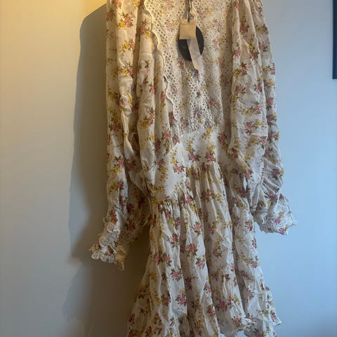Samsøe Samsøe sommerkjole for dame i størrelse S. Kjolen er beige med mønster og laget i viskose. Modellen har omslagssnitt med knyting i midjen og lange ermer. Passer godt til bruk på varme dager eller til hverdags og enkle anledninger.