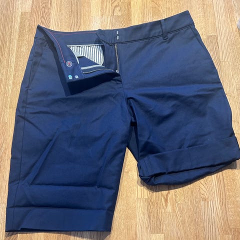 Tommy Hilfiger denimshorts for dame i størrelse S. Shortsen er i blå denim med klassisk femlommersdesign og rå kant nederst på bena. Materialet er denim (bomullsblanding). Passer til hverdagsbruk i varme måneder.