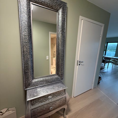 Perfekt til gang, stue eller soverom. Speilet skaper en romslig og lys effekt, mens bordet passer utmerket som dekorasjonsbord eller avlastningsbord.
