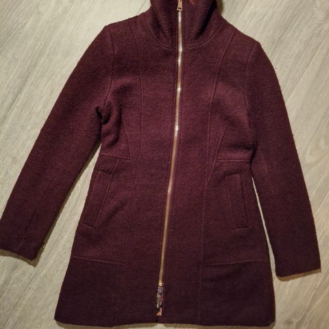 Nydelig ullkåpe fra Tara i str. 38, farge burgunder/vinrød. Med skinnreim til livet. Et parti under kragebretten som er falmet i skinnet, men ikke synlig når kragen brettes ned.