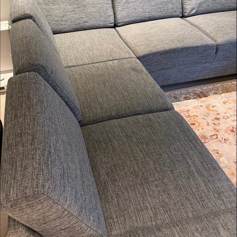 Skeidar hjørnesofa i grå tekstil. Sofaen har rette linjer, løse sete- og ryggputer samt en sjeselongdel. Det følger med løse pynteputer i mørk kontrastfarge. Passer som sittegruppe i stue eller tv-stue. Designet er oppgitt å være av Arne Jacobsen.