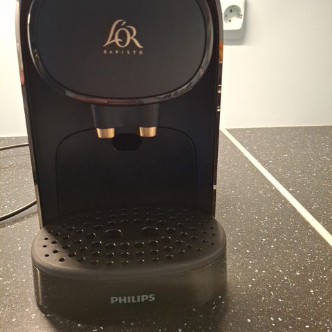 Philips L’OR kapsel kaffemaskin i svart. Maskinen bruker kaffekapsler og kan brygge ulike koppstørrelser som espresso og lungo. Den har to uttak for brygging av én eller to kopper om gangen, avtagbart dryppbrett og vannbeholder på baksiden. Betjenes med knapper på toppen for valg av ønsket koppstørrelse. Egnet for bruk på kjøkken eller kontor der man ønsker kapselbasert kaffe.