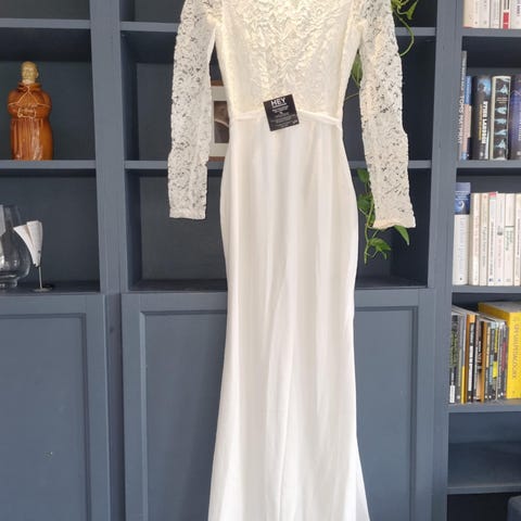 Stylein kjole til spesiell anledning for dame i størrelse S/M. Overdelen har blondepartier med lange ermer og v-utringning. Nederdelen har drapert effekt i front. Passer til formelle anledninger som selskap, fest eller andre spesielle begivenheter.
