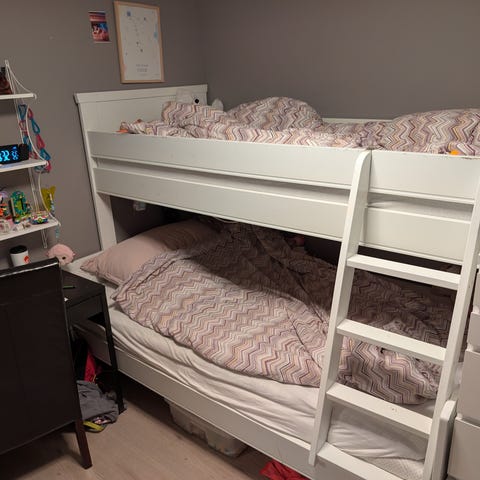 Jeg sydde to gardiner til senga, men siden én gardin viste seg å være nok, selges den andre helt ubrukt. På bildene er det to Kura-senger som er bygget sammen til en køyeseng, men gardinhøyden er den samme som på en vanlig Kura.