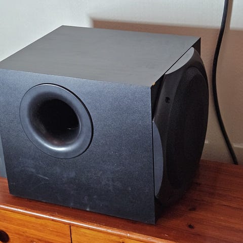 8" basskasse. 150 watt. 6 ohm. Høyde 23,5. Lengde 37,5. Dybde med frontrekk 27,5. Lagt ny demping innvendig, montert møbelknotter under, bedre terminal med ny kabling innvendig, og forlenget b.r. port litt. Man kan også bytte til ett bedre element. Tar liten plass, så passer der det er liten plass, til bil, båt, truck, van, etc. Tar liten plass. Se også mine andre annonser for mye rart innen hvs. lyd!