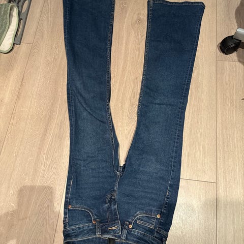 &Denim bootcut jeans for dame i blå denim. Modellen har høyt liv og bootcut-ben. Størrelse EU 32 / W32. Materiale ifølge lappen er hovedsakelig bomull med en liten andel elastan for stretch. Klassisk femlommersmodell med glidelås og knapp i front. Passer til hverdagsbruk og kan kombineres med ulike topper og sko.