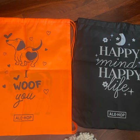 ALEHOP stoffposer i to farger: sort med teksten 'Dream Big Work Hard' og lilla med tegning av to katter og teksten 'I Meow You'. Posene er laget av stoff og egnet for generell bruk.