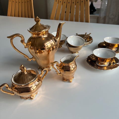 Kaffeservise kaffekanne kopper og skåler gullfarget porselen