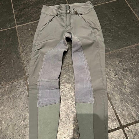 Young Rider ridebukse for barn i størrelse 140. Buksa er svart med blå felt nederst på beina. Den har helskinns- eller kneforsterkning (silikon/skinnimitasjon) for bedre grep i salen, samt en liten glidelåslomme foran. Egnet som ridebukse til barn/unge ryttere til trening og ridning i stall og på ridebane.