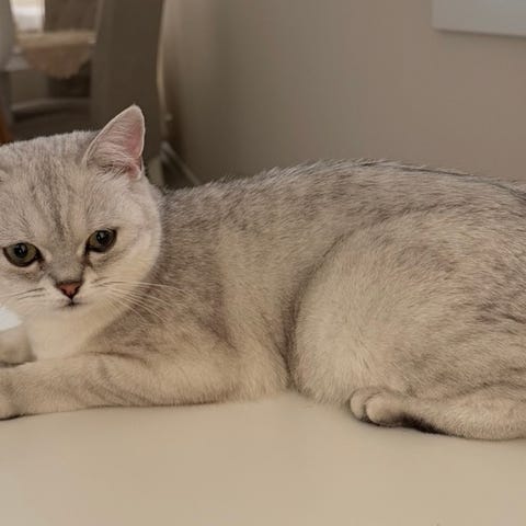 Vi omplasserer vår kjære Scottish Straight (hvit med blåt øyne og litt gullig skær på hode og hale). Hun er 1,5 år. Hun er en svært sosial, kosete og barnevennlig innekatt som elsker fanget og å sove i sengen. Veldig rolig, kjærlig og renslig.