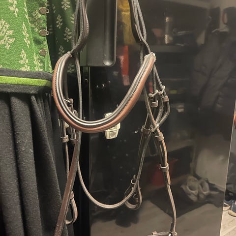 Pent Travhodelag i lær, med sjekk selges. Hodelaget er fra Finntack og i størrelse full.