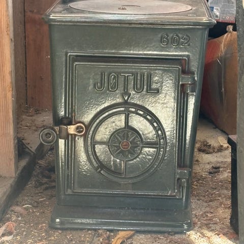 Jøtul 602 vedovn i støpejern. Klassisk frittstående ovn med frontdør med luftregulering og kokeplate på toppen. Rillet sidepanel og Jøtul-emblem på siden. Pipeuttak på toppen slik det vises på bildene.