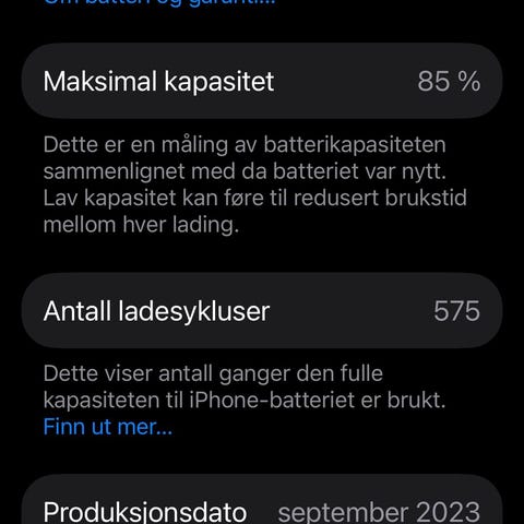 Selger en svart Apple iPhone 15 mobiltelefon med 256 GB lagringskapasitet. Kjøpte den i oktober 2023, og har alltid brukt et stort silikondeksel, så den er uten merker. Mobilen er ellers pent brukt og har en batterikapasitet på 90 %. Selges med original eske og tilhørende USB‑C‑kabel.