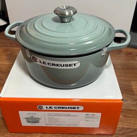 Le Creuset gryte . Klassisk rund gryte med lokk og metallknott på toppen. Egnet til matlaging på kjøkkenet, som for eksempel gryteretter, supper og steking. Laget i solid materiale som tåler høy varme og gir jevn varmefordeling.