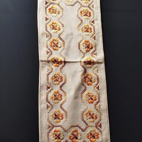 Nydelig håndbrodert retro løper/duk i varme bruntoner med blomster i gult, grønt og oransje