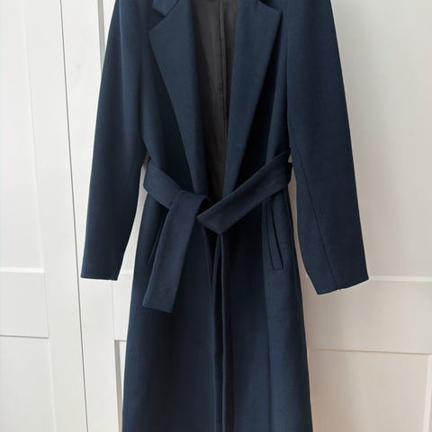 Stilig varm kåpe i ull blanding med lommer på sider og en liten splitt bak og belte.Lengde 90cm.