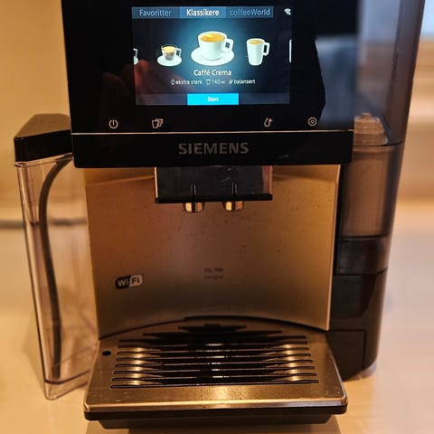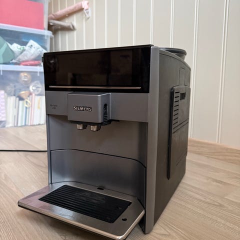 Siemens helautomatisk kaffemaskin i sølvfarge. Maskinen har frontpanel med display og berøringsknapper for valg av ulike kaffedrikker som kaffe, cappuccino og varmt vann. Integrert tut for kaffe og separat damprør/slange for melkeskumming. Dryppbrett og kaffeutløp er plassert i front for enkel bruk og rengjøring. Egnet for brygging av både svart kaffe og melkebaserte drikker i husholdning eller mindre kontormiljøer.