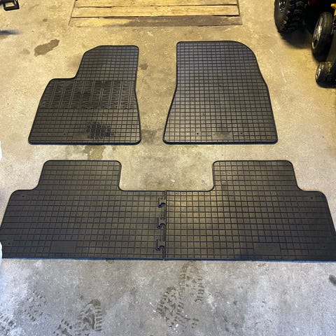Tesla gulvmatter i svart gummi. Materialet er plast/gummi med forhøyede kanter og mønstret overflate for å samle opp smuss og fukt. Passer til Tesla-S modell med tilsvarende innredning og festepunkter som på bildene. Egnet som helårs gulvbeskyttelse i bilen.