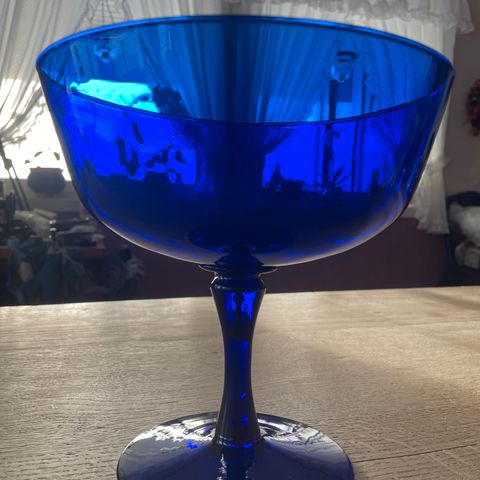 Hadeland glasskål på stett i klart glass med blå kant øverst. Skålen har rund fot og bred åpning. Egner seg til servering av dessert, snacks eller som dekorasjon. Designet har en tydelig blå bord langs kanten som gir kontrast til det klare glasset.