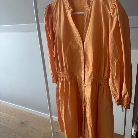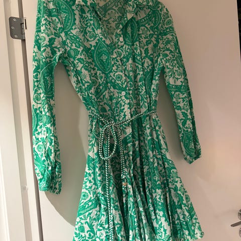 Zara sommerkjole i størrelse S for dame. Kjolen er laget i bomull og har grønnmønstret stoff med hvit bunn. Modellen har lange ermer, krage og knappelukking foran. Det følger med knytebelte i livet for justering av passform. Lengden går omtrent til over kneet, avhengig av høyde. Passer som lett sommerkjole eller til hverdagsbruk.den ene hempen med belte har løsnet.