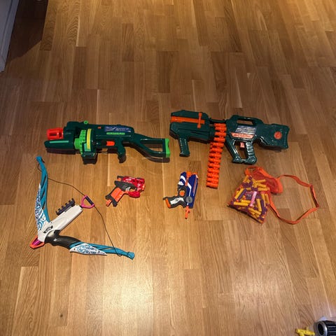 Nerf lekergevær i plast. Settet består av to blastere i ulike størrelser og utforminger. Den ene er hovedsakelig oransje og grå, med skulderstøtte og håndtak foran. Den andre er hovedsakelig blå og oransje, med avtakbare deler som kolbe og ekstra frontstykke. Begge er beregnet for skumprosjektiler (piler/darts) og er laget for lek og aktiviteter for barn. Egner seg til innendørs og utendørs lek der man bruker Nerf-kompatible skumpiler.