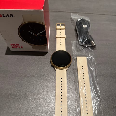 I esken følger det med 2 ladere, reimer og brukerdokumentasjon. Klokken er egnet til trening og hverdagsbruk med aktivitets- og pulsregistrering.